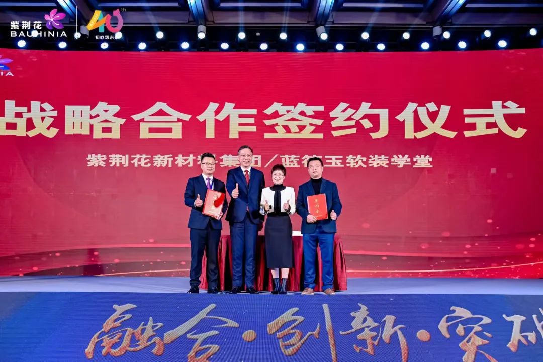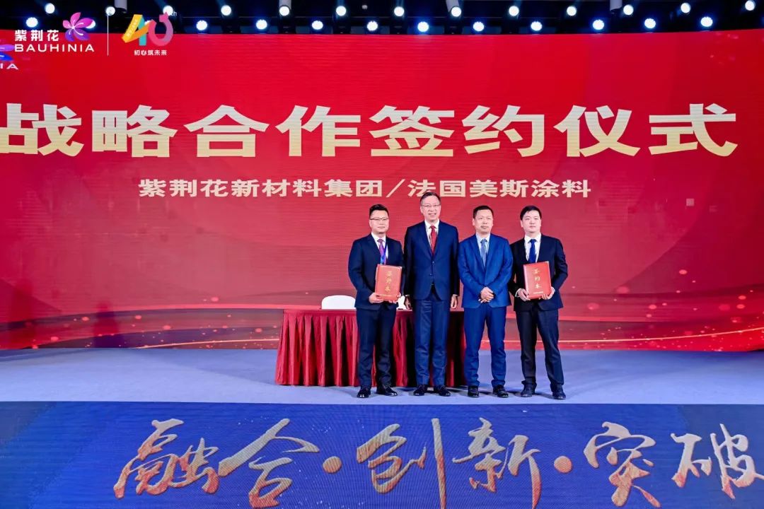 《涂料经》注意到,本次活动,紫荆花还在现场举行了两场重磅签约仪式,紫荆花分别与法国美斯涂料、蓝筱玉软装学堂战略合作签约。