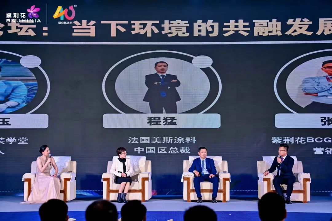 在随后举行的“融合论坛:当下环境的共融发展之道”环节,蓝筱玉老师、程猛总裁均表示与紫荆花的强强联合战略合作,互利共赢,将为消费者提供更高品质、高颜值、高性价比的艺术涂料产品以及家居色彩搭配解决方案。