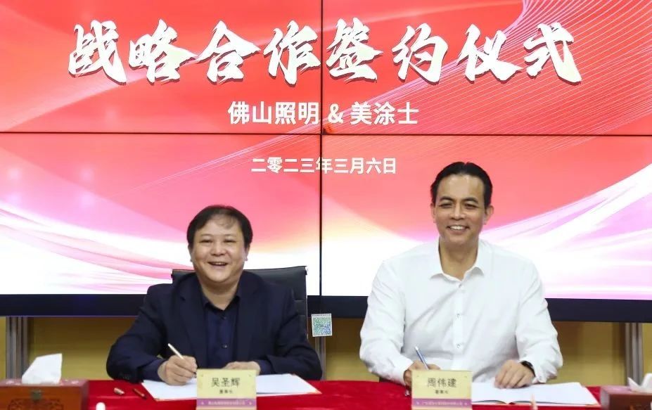 3月6日,广东美涂士建材股份有限公司(以下简称:美涂士)与佛山照明签订战略合作协议。佛山照明董事长吴圣辉、副总经理张勇;美涂士董事长周炜健、交付中心总经理宋献军、战略部副总经理杨波等双方高层出席签约仪式。