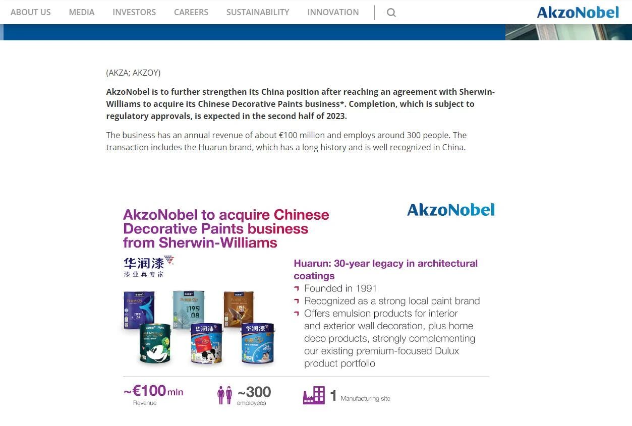 阿克苏诺贝尔官方网站欣然公布了对“华润漆”的收购