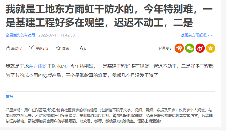 7月11日,东方财富网上这则帖子分外惹人关注。由于牵扯到防水巨头东方雨虹,行业内有人表示,东方雨虹极有可能是被冤枉的,这个人是外包施工方的可能性更大些。但无论如何,几个月没发工资,这表明今年工程领域底层的处境——难,真难,特别难。有人跟帖道:“我都悄悄在工地捡废品卖,补贴家用。”还有人表示:“确实如此”。