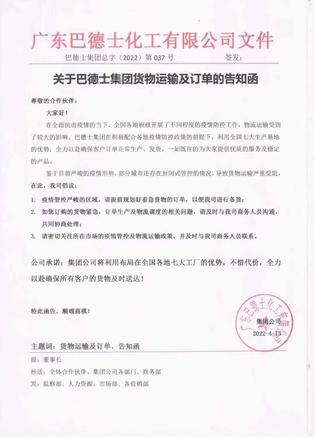 最后,巴德士在告知函中承诺:集团公司将利用布局在全国各地七大工厂的优势,不惜代价,全力以赴确保所有客户的货物及时送达!