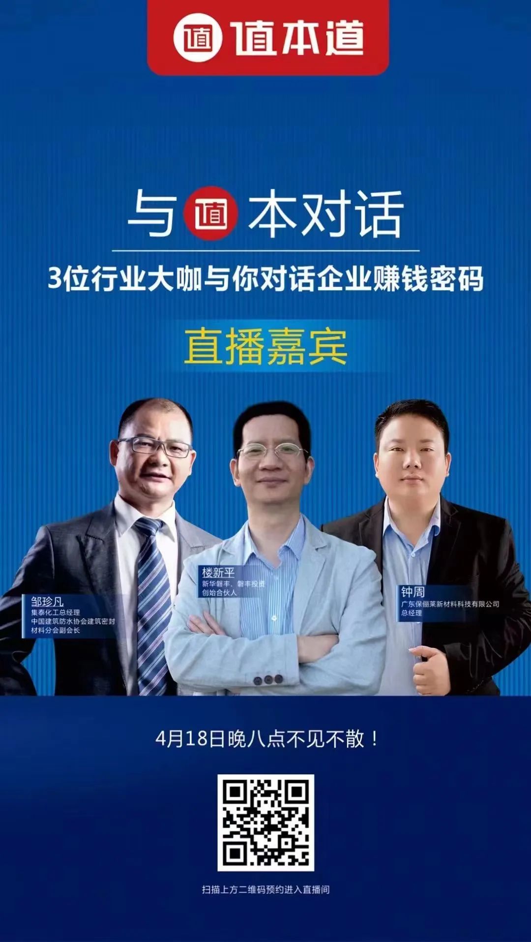 除了邹珍凡之外,本次直播参与嘉宾还包括新华磐丰投资创始合伙人楼新平,以及另一家仿石漆企业负责人。这同时也是三者的首度携手直播论道。他们将在直播中碰撞出什么样的火花?欢迎扫描下方海报二维码预约进入直播间。直播将于4月18日晚8时正式开始。