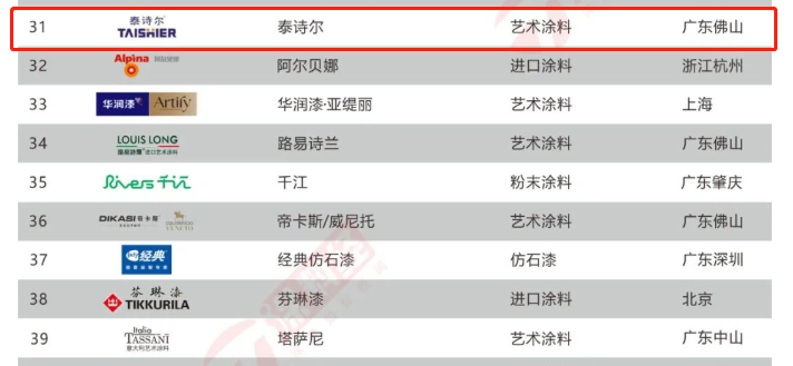 其中,“肌理壁膜开创者”泰诗尔凭借自身实力和影响力上榜该榜单,位列榜单31名,在肌理壁膜领域排名第一。