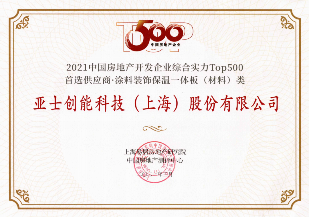 2022年“中国房地产TOP500首选供应商品牌测评成果”即将发布。在去年该发布会上,亚士以16%、12%的品牌首选率高居保温材料类和涂料装饰保温一体板(材料)类双榜榜首。