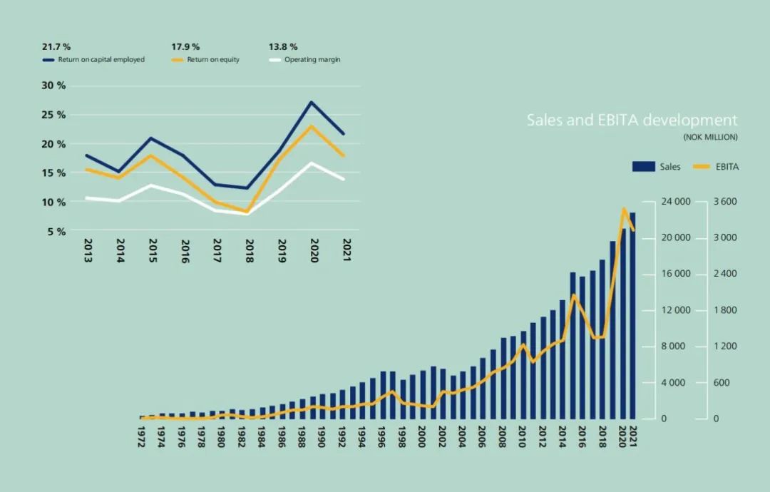 年报显示,佐敦集团2021年经营活动所产生的现金流量净额为19.68亿挪威克朗,而上一年度则为32.72亿挪威克朗。已动用资本回报率(ROCE)为21.7%,则上一年度为27.2%。股东权益回报率(ROE)则为17.9%,上一年度为23.0%。营运利润率则比上一年度有所下降为13.8%。