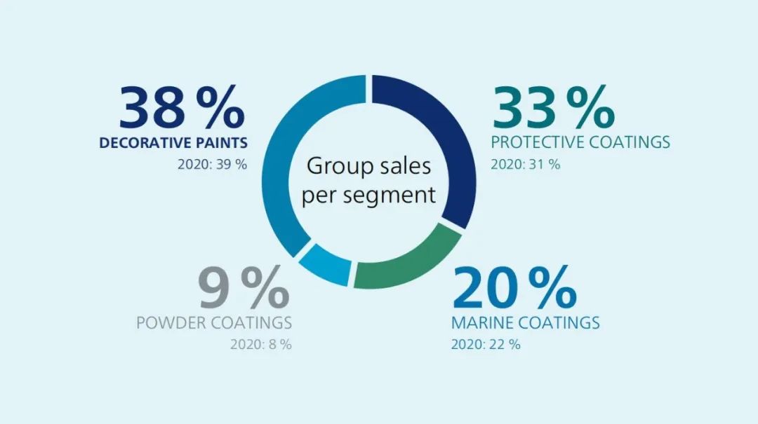近日,佐敦涂料(Jotun)对外披露了2021年全年业绩报告。全年实现销售收入为228.09亿挪威克朗(约合161亿元人民币),比前一年增长8%;营业利润为31.38亿挪威克朗(约合22亿元人民币),比前一年下降了10%;税前利润为28.90亿挪威克朗(约合21.16亿元人民币),同比下降8.47%;净利润为21.11亿挪威克朗(约合人民币22.1亿元),同比下降11.23%。