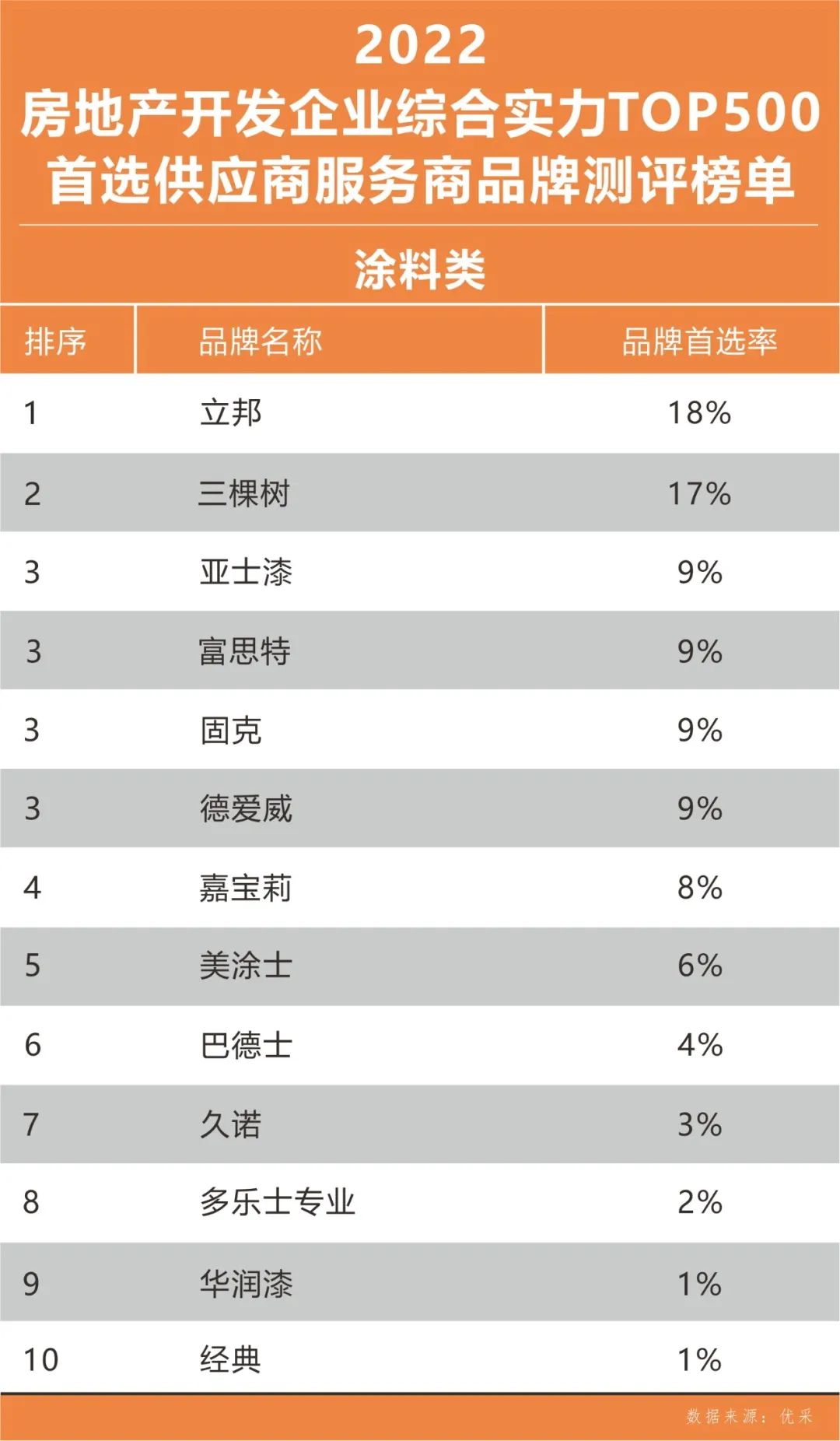 作为该榜单的冠军,立邦是涂料行业内唯一连续11年稳居榜首的涂料品牌,更在多项榜单排名中蝉联榜首。在持续实现落地服务100%百强地产的同时,立邦也再度获评已合作数十年的TOP3战略合作房企落地率第一。