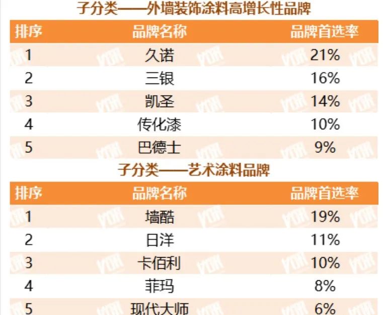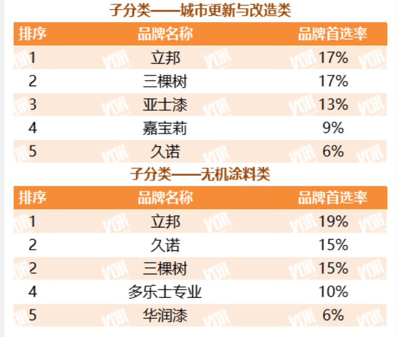 其中立邦以品牌首选率18%位列榜首;三棵树品牌首选率为17%紧随其后;亚士漆、富思特、固克、德爱威以品牌首选率9%并列第三。可以发现第二名和第三名有一个较为明显的“分水岭”,这也给后面的企业一个追逐与发展的进步空间,有可能成为下一次榜单一跃而上的“黑马”。