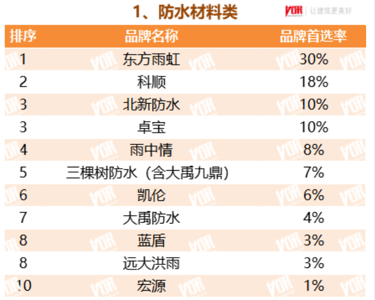 防水材料类,东方雨虹以30%的品牌首选率一骑绝尘。该榜单上榜的其他品牌有:科顺、北新防水、卓宝、雨中情、三棵树防水(含大禹九鼎)、凯伦、大禹防水、蓝盾、远大洪雨、宏源。