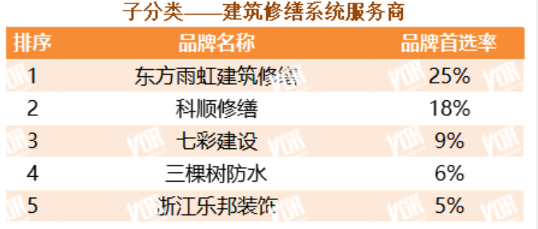 在子分类当中,建筑修缮系统服务商有较高的讨论度。上榜的品牌有:东方雨虹建筑修缮、科顺修缮、七彩建设、三棵树防水、浙江乐邦装饰。