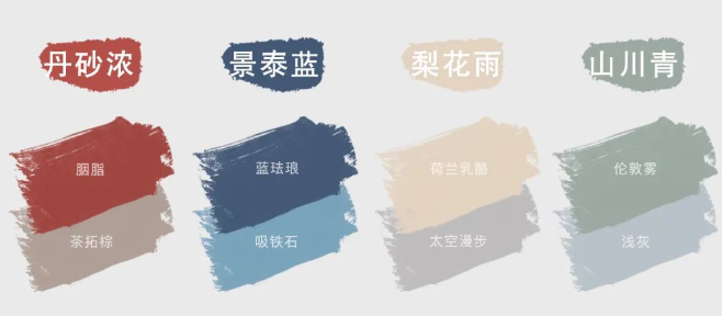 第一组丹砂浓,主色调为红色,突出大气恢弘的中国色韵味。朱红色自古正色,也是皇家御苑装饰宫墙的颜色,有着庄严恢弘之感。立邦穿越古今,选择以大气沉稳的“胭脂”搭配低饱和的“茶拓棕”,在雍容沉稳的传统氛围中注入间接利落的都市感,使得建筑保留古典的恢宏大气之外又综合了内敛亲和的气质,更好的融入现代都市环境,赋予建筑深厚的文化底蕴。