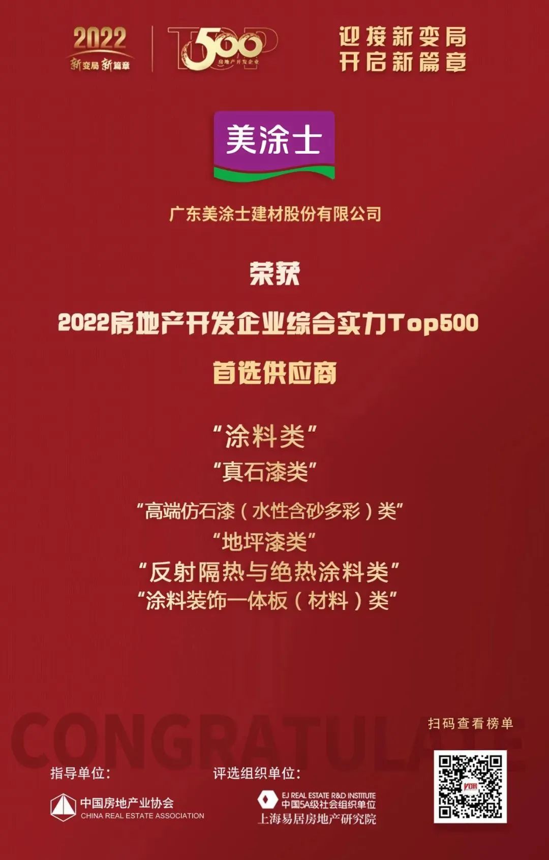 “新变局,新篇章”,3月29日,由中国房地产业协会、上海易居房地产研究院共同主办的2022中国房地产500强测评成果发布会暨房地产高峰论坛在北京国贸大酒店盛大召开,美涂士实至名归,连续8年蝉联国房地产开发企业综合实力TOP50首选供应商。