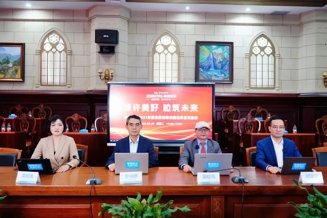 2022年3月29日,集泰股份举行2021年度网上业绩说明会。左起:集泰股份副总经理兼董事会秘书吴珈宜、副总经理兼财务总监罗鸿桥、总经理邹珍凡、副总经理兼研发技术总监胡亚飞