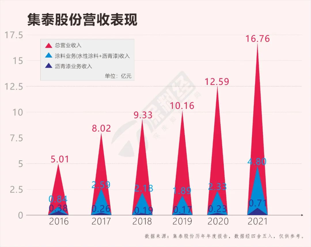 《涂料经》记者查看了2017年集泰股份上市以来的历年年报后发现,从有数据披露的2014年(企业上市需要追溯上市前3个年度的业绩数据)至今,集泰涂料业务至少经历了两个飞跃期——第一个为2016-2017年度,;第二个便是2020-2021年度。