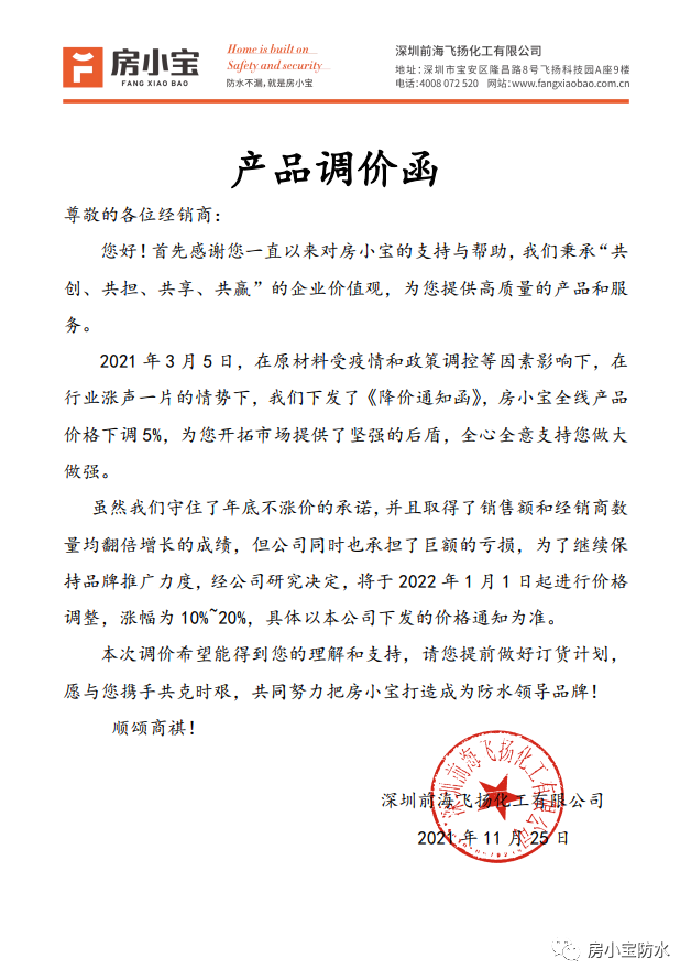 由于国家政策的变化,原材料、运输等运营成本的不断上升,为了协同双方的生产发展和保持良好的业务关系,本着互惠互助的原则,经过多方面的慎重考虑,房小宝防水定于2022年1月1日起,对全线产品价格进行调整: