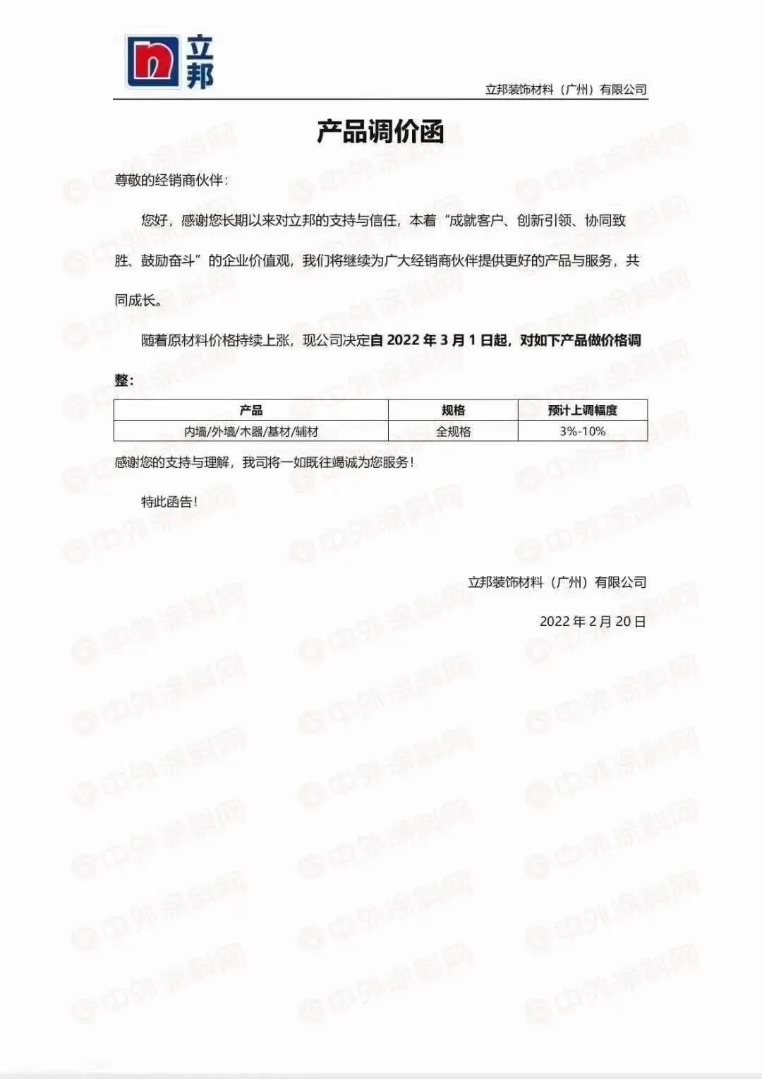 2月20日,立邦装饰材料(广州)有限公司发布产品调价函称,随着原材料价格持续上涨,现公司决定自2022年3月1日起,对内墙/外墙/木器/基材/辅材全规格产品做价格调整,预计上调幅度3%-10%。