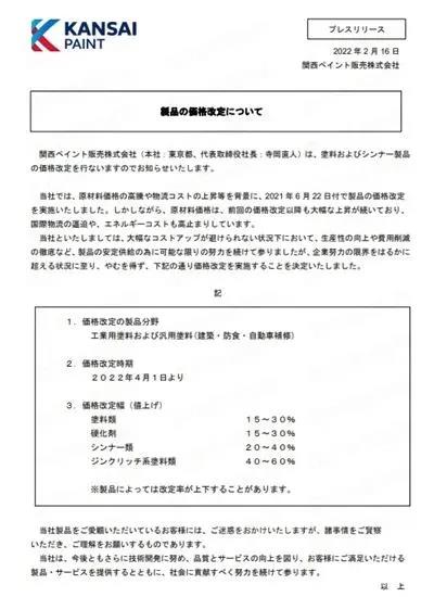 2月16日,关西涂料股份有限公司发布《关于涂料及稀释剂产品的价格调整》的通知。价格调整的产品领域包括工业涂料和通用涂料(建筑、防腐、汽车维修),价格修改时期自2022年4月1日起。