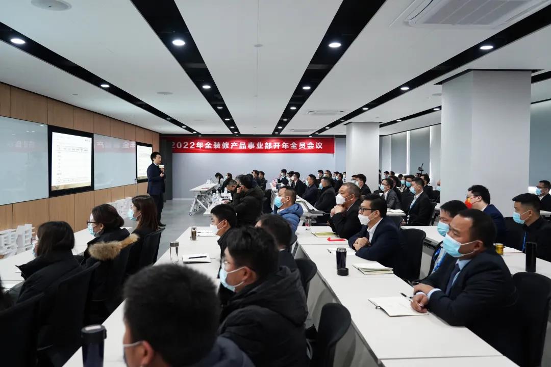 全装修产品事业部副总经理施以森汇报了事业部2021年工作开展情况,部署了2022年重点工作推进计划。他要求公司全员从思想、经销商体系、行动力、产品、终端门店等多角度贯彻事业部“聚焦零售,致胜终端”战略,为嘉宝莉全装修事业部2022年的变革,提供了新的指导方向。