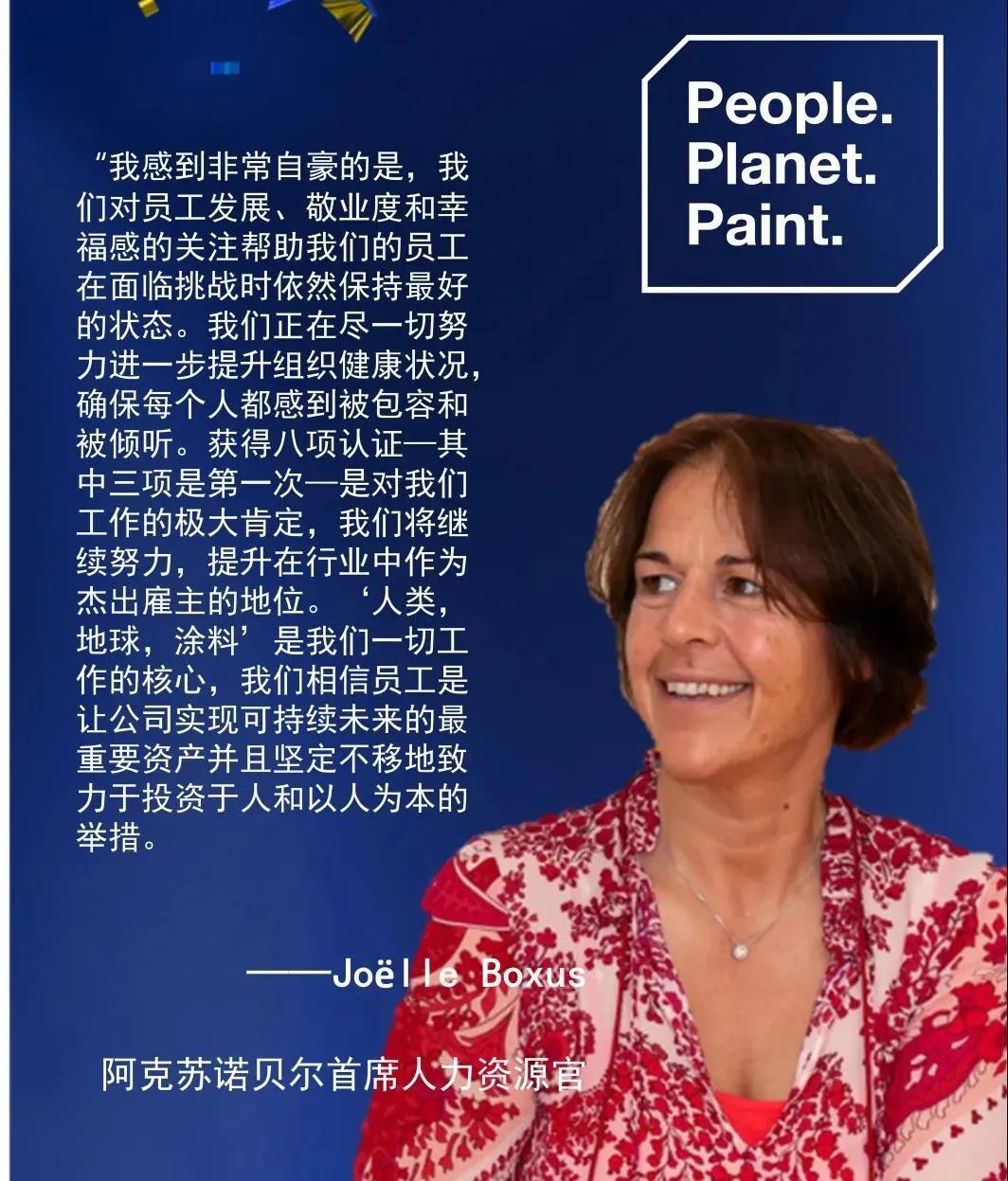 凭借在业务战略,领导力和价值观方面的优异得分,阿克苏诺贝尔的人力资源努力同样在全球范围内获得了认可。除了中国市场之外,阿克苏诺贝尔也在分别在荷兰、美国连续三年,巴西连续六年和英国连续十年得到同样的认证。今年更是在法国,德国和瑞典首次获得“杰出雇主”的认证。能够在5个欧盟国家都获得认证,实属不易,这也意味着阿克苏诺贝尔获得了 “欧盟杰出雇主”认证。