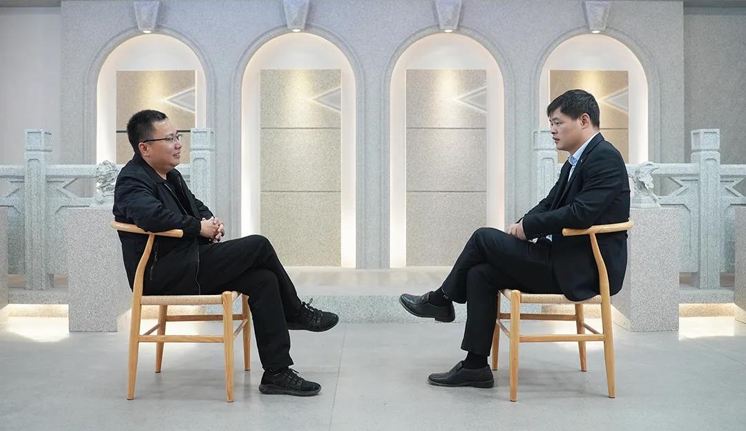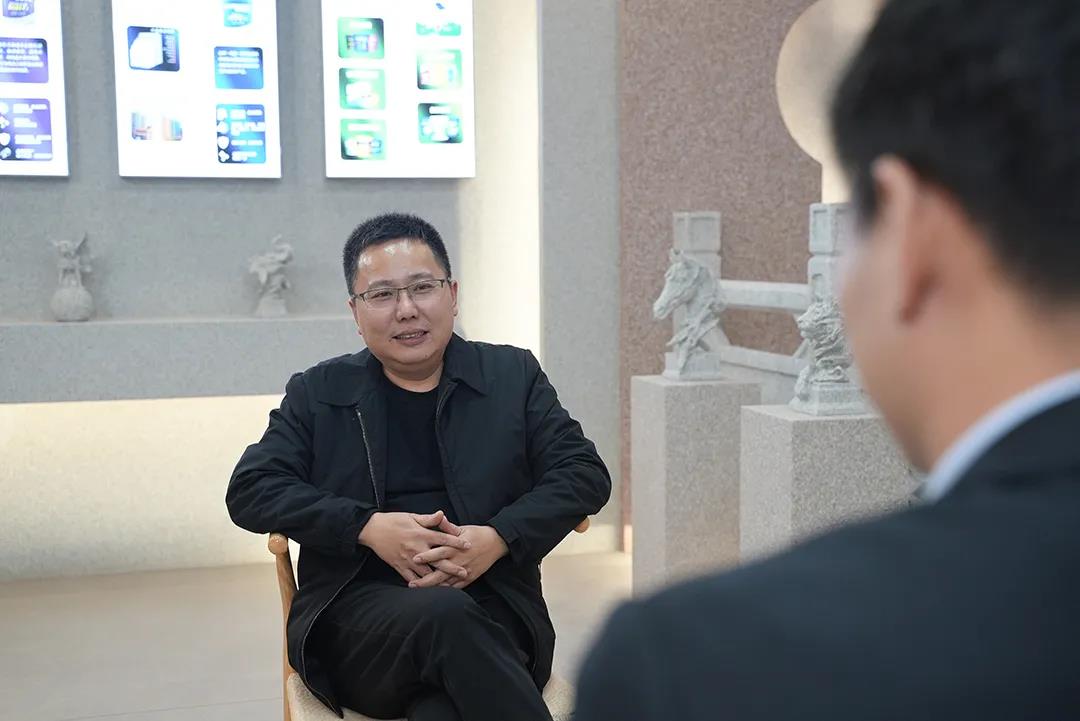 在巴德士仿石艺术漆的展厅里,巴德士仿石艺术漆事业部总经理史亮(左)与《涂料经》记者面对面交流