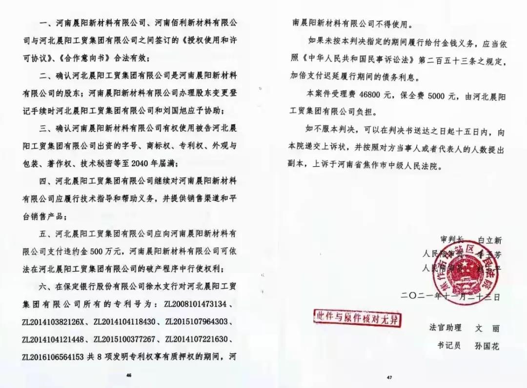 2021年10月18日,保定中院就1623号案作出终审判决,认为河南晨阳的上诉请求不能成立,依法驳回上诉,维持原判。