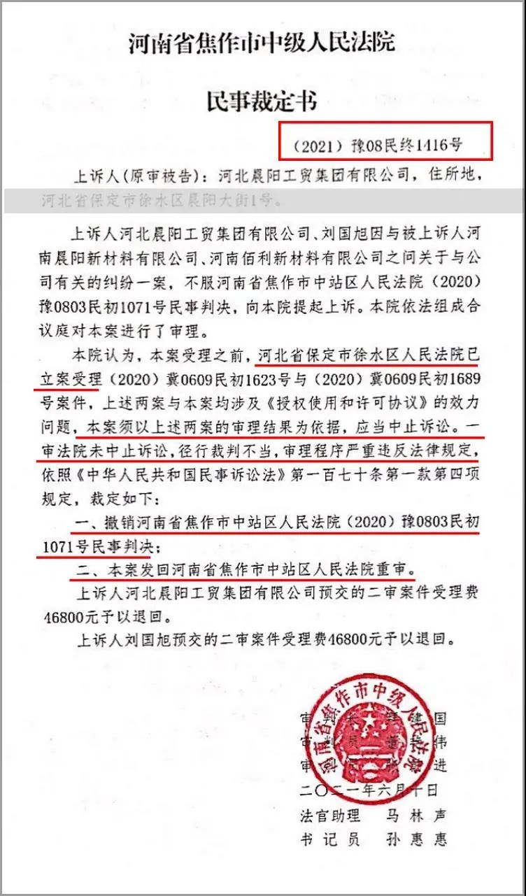 2021年8月19日,徐水法院再次开庭审理了1623号案,并于8月27日做出判决:撤销晨阳集团与河南晨阳于2020年8月20日签订的《授权使用和许可协议》。河南晨阳不服一审判决向保定中院提出上诉。