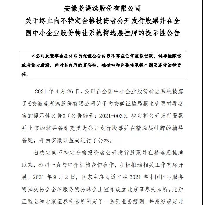 据悉,4月26日,菱湖股份在全国中小企业股份转让系统披露了《安徽菱湖漆股份有限公司关于向安徽证监局报送变更辅导备案的提示性公告》(公告编号:2021-003),决定将公开发行股票并上市的辅导备案变更为公开发行股票并在精选层挂牌的辅导备案,并由安徽证监局进行了公示。8月20日菱湖股份进行披露。