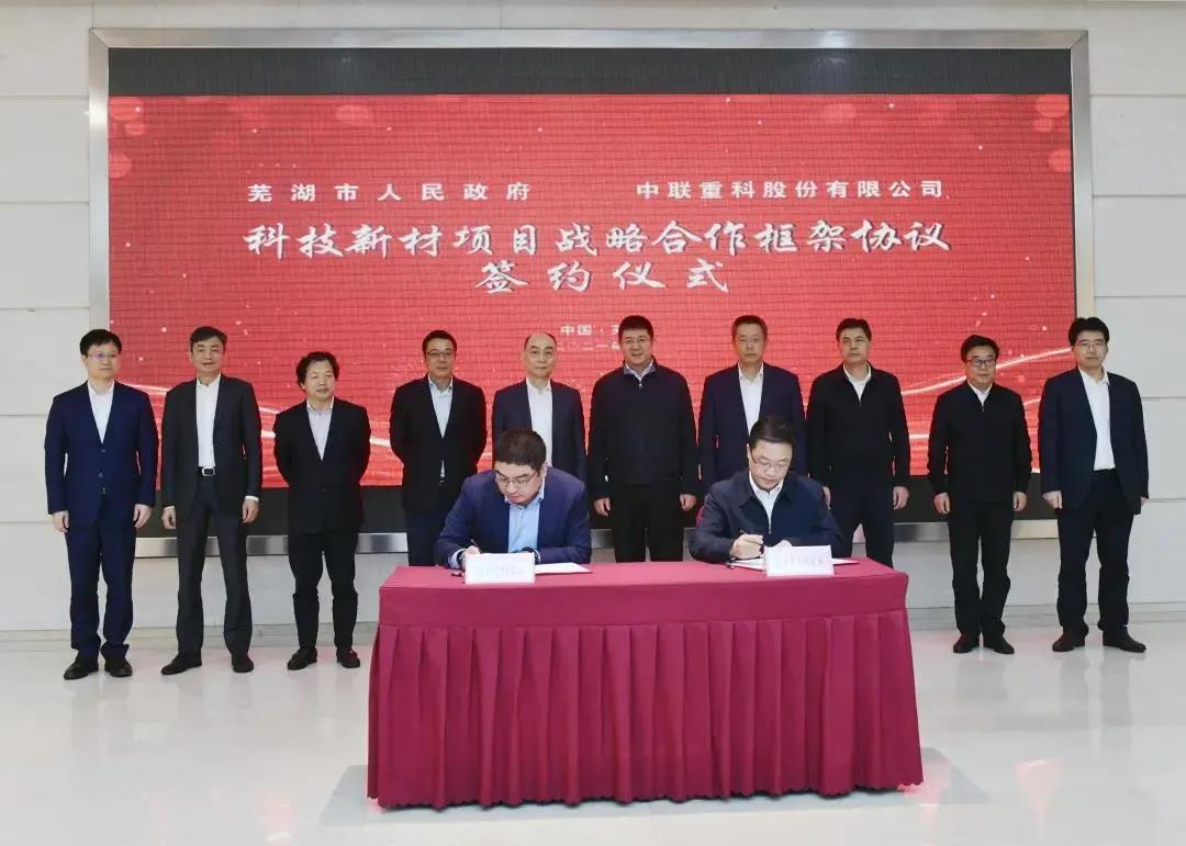 日前,安徽省芜湖市政府与中联重科签署科技新材料项目战略合作框架协议。中联重科董事长、CEO詹纯新,芜湖市委书记单向前,市委副书记、市长宁波出席仪式并见证签约。