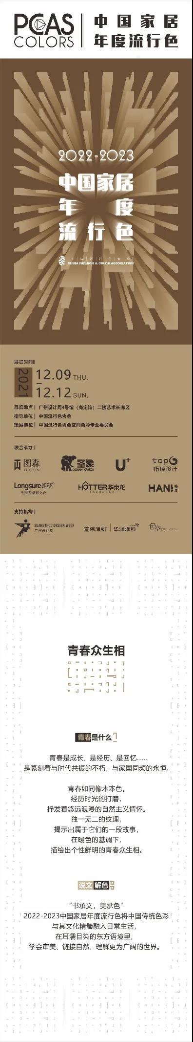 以色彩赋能设计,开启崭新一年,以“青春众生相”为引题的2022-2023中国家居年度流行色概念主题展即将于12月9日在广州设计周首发。