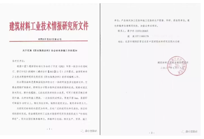 在此背景下,由建筑材料工业技术情报研究所组织的《防水隔热涂料》的行业标准编制工作正在紧锣密鼓的开展中。该标准将根据中国工程建设标准化协会关于印发《2021年第一批协会标准制订、修订计划》的通知(建标协字 【2021】111号 )文件要求,制定更加科学,具有广泛适用性和代表性的标准内容。