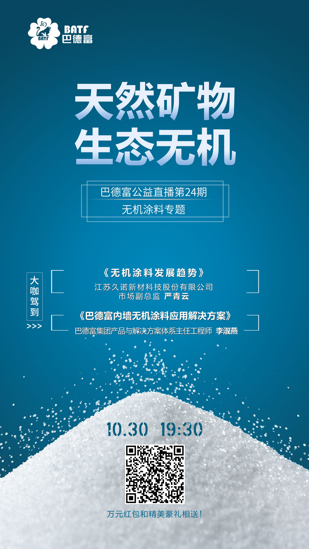 重磅!重磅!观众呼声颇高的无机涂料干货内容果断给大家安排上了!10月30日(本周六)19:30,巴德富公益直播间邀来重磅嘉宾——来自江苏久诺新材科技股份有限公司市场副总监严青云——带来无机涂料趋势分享,精彩不容错过!