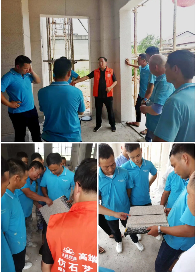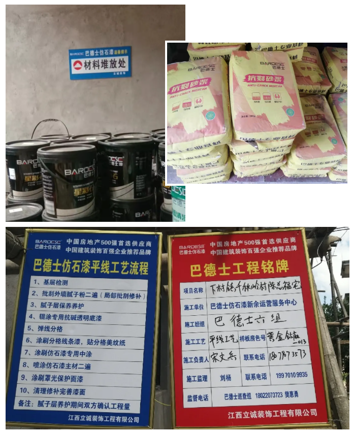 接地气的巴德士仿石艺术漆乡镇墙体广告,以及统一工作服点的施工人员,让巴德士品牌可视化、形象化。
