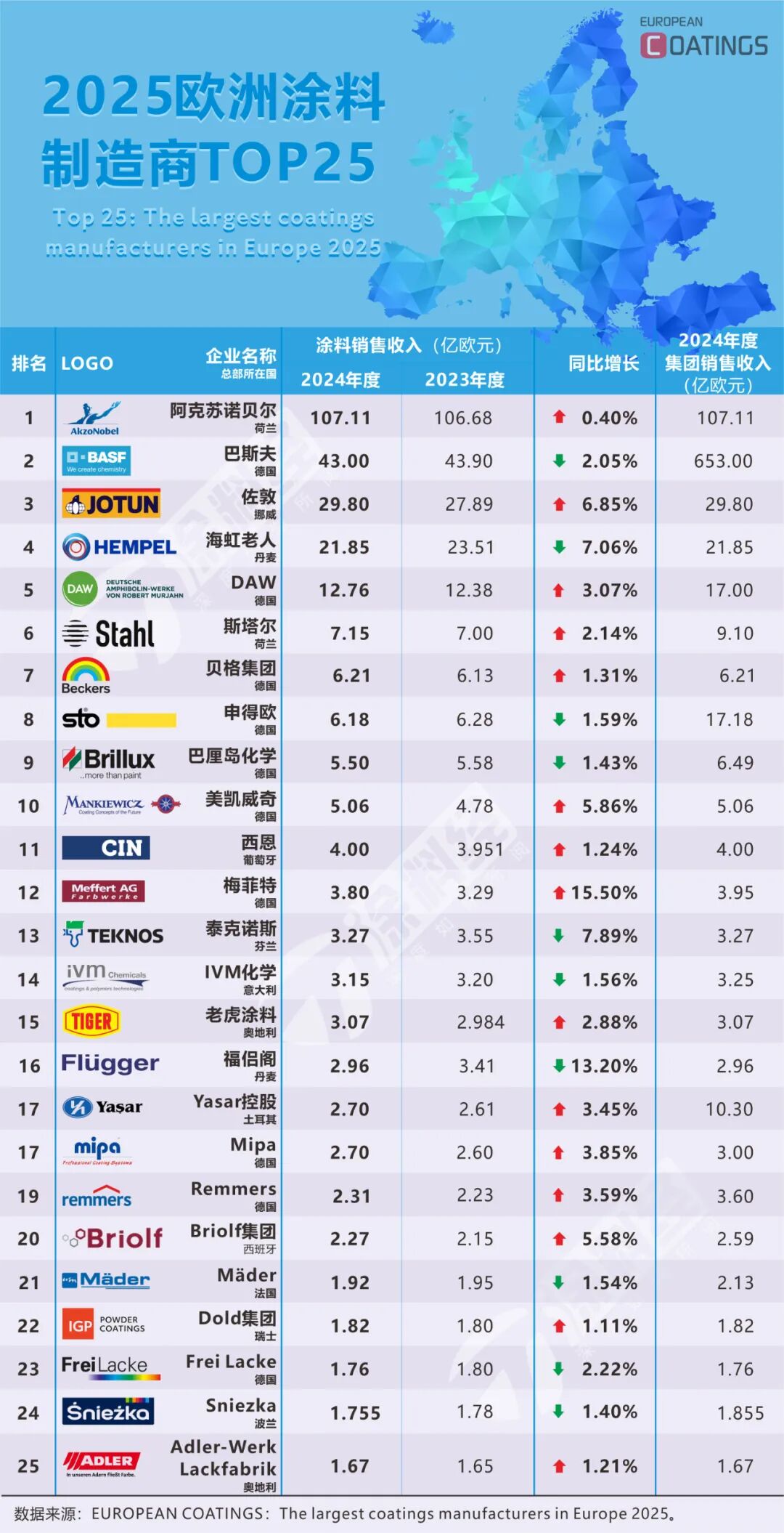 5月19日,《欧洲涂料杂志》(the European Coatings Journal)发布“2025欧洲涂料制造商25强”(TOP 25:The largest coatings manufacturers in Europe 2025)排行榜。