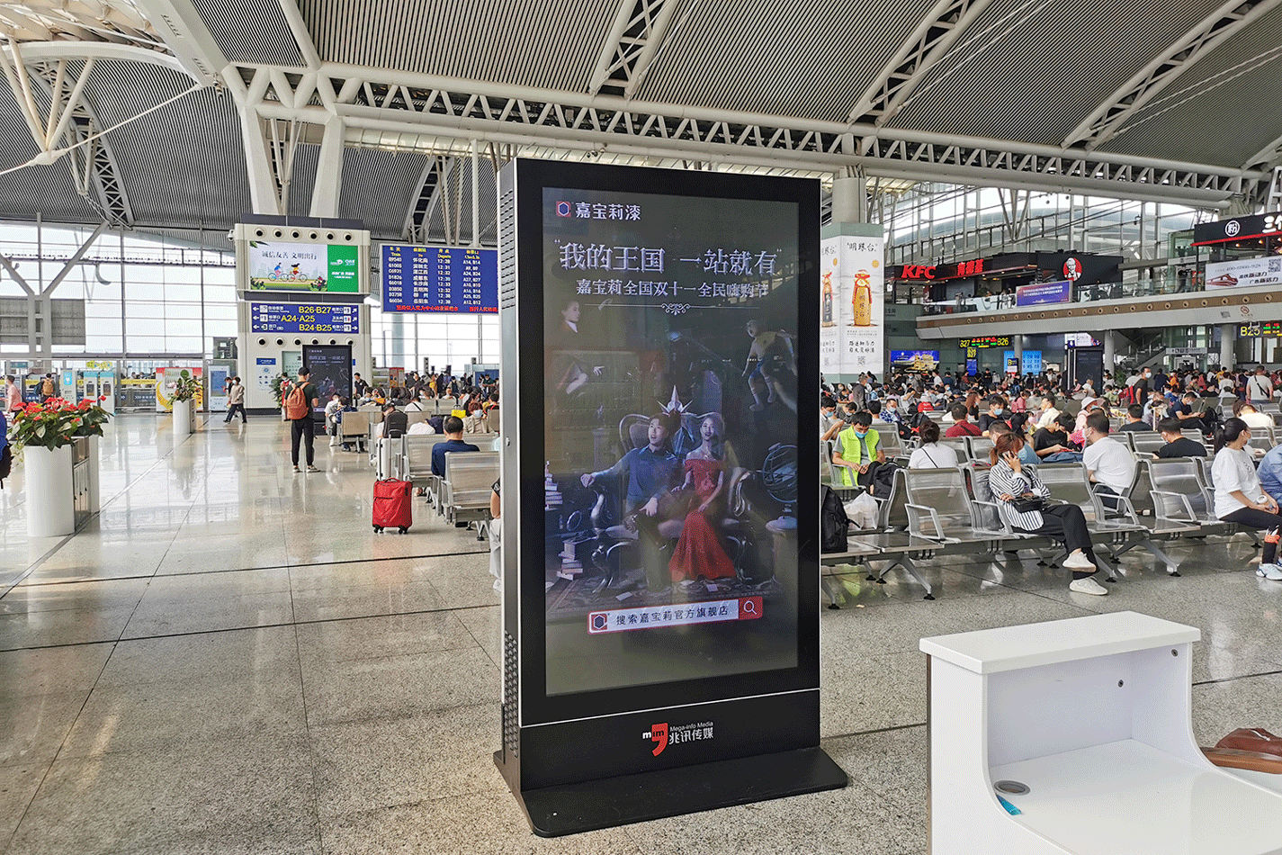 飞机和高铁已经成为了商务人士重要的出行交通工具。嘉宝莉此次通过广告大面积的霸屏,再加上机场、高铁全运营时段的广告展现,向路过的人群全方位的展示了嘉宝莉的“我的王国,一站就有”双十一嗨购节活动,大大提高了品牌知名度和活动热度。