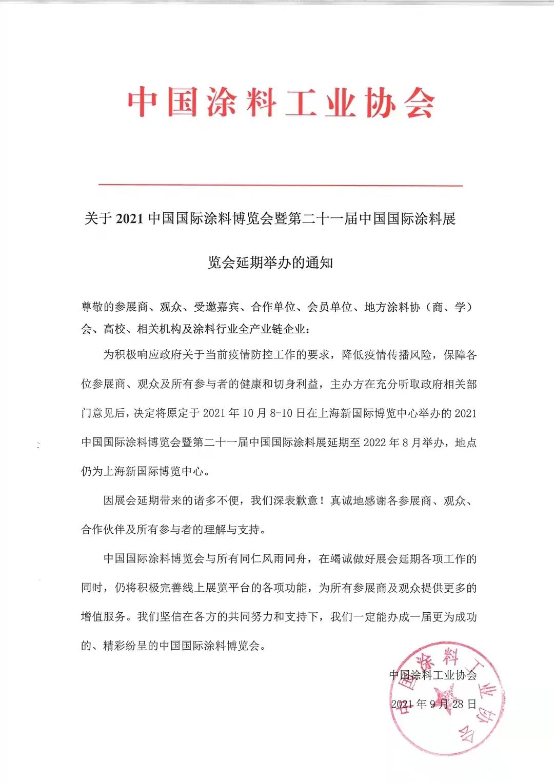 9月28日,中国涂料工业协会发通知表示,原定于2021年10月8日-10日在上海新国际博览中心举办的2021中国国际涂料博览会暨第二十一届中国国际涂料展(以下简称“2021涂博会”)延期至2022年8月举办。