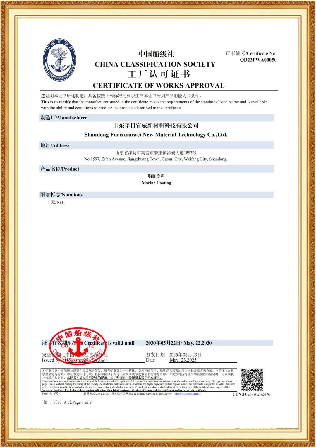 公告显示,此次成功获得了包括环氧船底防锈漆、环氧船体连接漆、环氧船用防锈漆等在内的7款船舶涂料产品的认证。于孚日宣威而言,这不仅是一纸认证,更是其正式进军被誉为工业防腐领域“皇冠明珠”的船舶涂料市场的里程碑,也标志着其在功能性涂层材料的多元化征程上迈出的坚实而关键的一步。