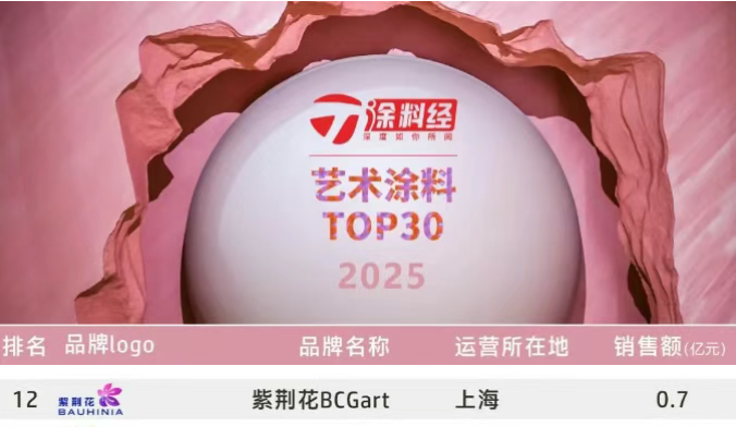 在此前《涂料经》发布的,“2025中国涂料头部品牌榜·艺术涂料TOP30”(简称“中国艺术涂料品牌30强”、“艺术涂料TOP30”)中,紫荆花BCG art位列12名。