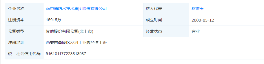 雨中情成立于2000年5月12日,是创始于西北的防水企业。主要从事建筑防水材料的研发、生产和销售,并提供防水工程施工服务。2020年底,雨中情完成股份制改造,加快了拥抱资本市场的步伐。目前旗下布局陕西西安、陕西咸阳、甘肃兰州、江苏泰州、山东寿光、陕西渭南生产基地,“立足西北、面向全国”的产业布局已具雏形。