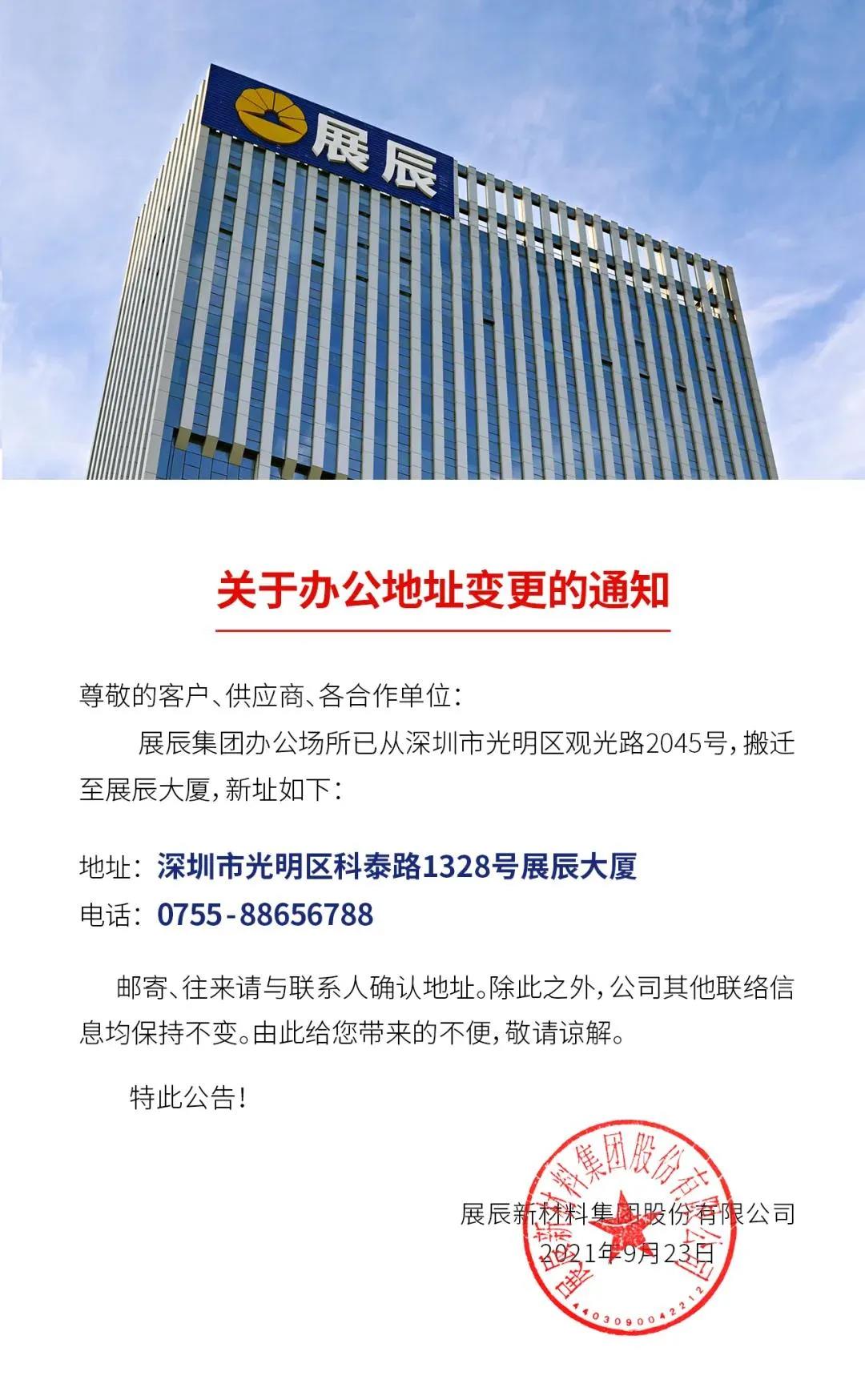 9月24日,展辰新材发布了一则关于办公地址变更的通知,简短却意义深远——展辰集团办公场所已从深圳市光明区观光路2045号,搬迁至展辰大厦(深圳市光明区科泰路1328号展辰大厦)。