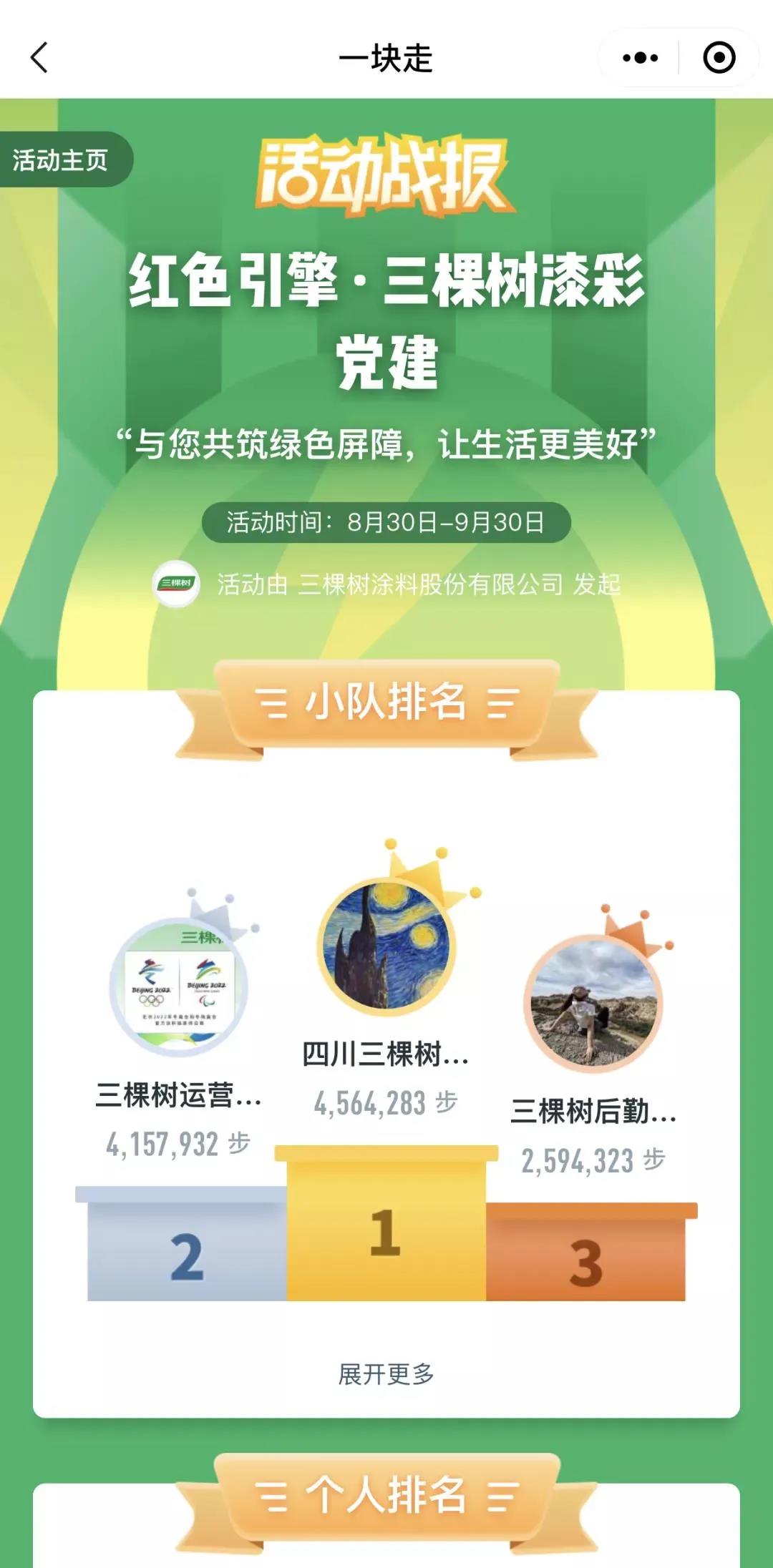 同时,三棵树党委以“红色引擎·三棵树漆彩党建”为主题,号召全体党员及员工参与#一块走【云游中国·重走红色路】,通过公益捐步支持“一亿棵梭梭”项目;每日鼓励党员及员工低碳徒步公益,把充满爱心的每一小步汇聚成支持环保事业的一大步。