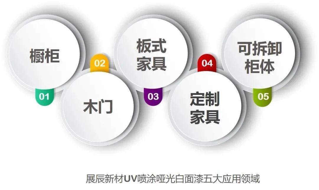 展辰UV喷涂哑光白面漆能够在橱柜、木门、板式家具、定制家具、可拆卸柜体上实现应用,并且拥有成熟的涂装解决方案,可助力家具企业实现高品质、高效率、高效益的环保涂装。