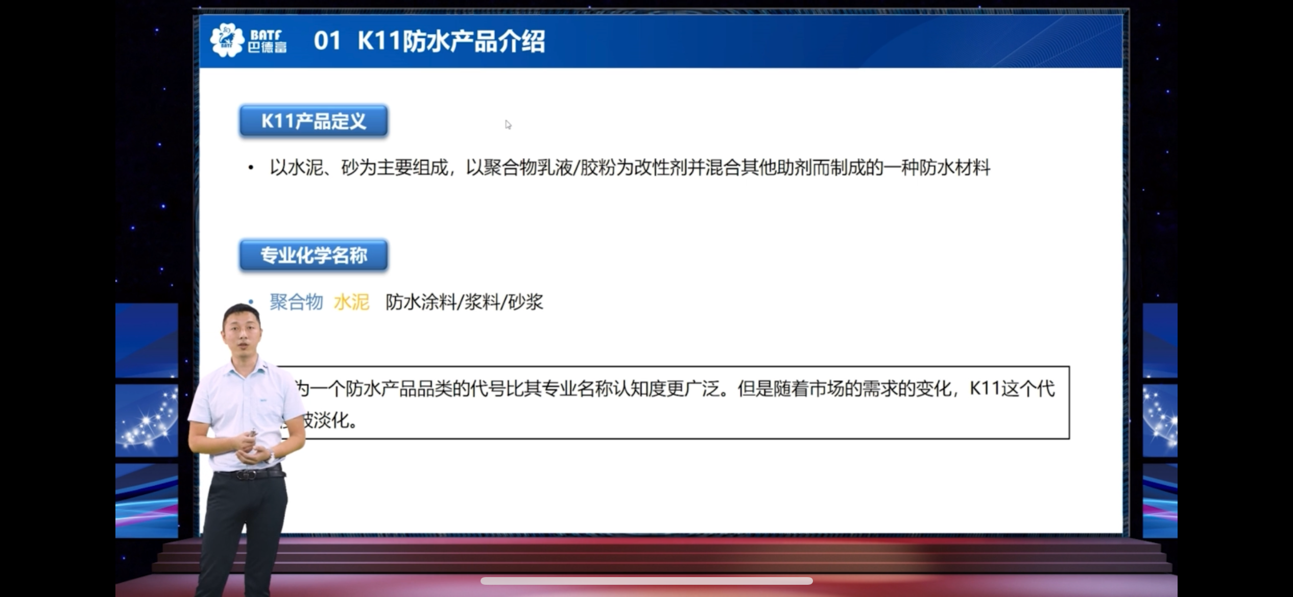 他主要从K11防水产品介绍:产品定义、产品分类、配方构成、应用部位;常见问题分析及解决方案:施工性、涂膜“发白”、气味,这两方面让我们重新认识“K11”,而且他表示防水涂料的痛点都能通过技术领先的乳液产品进行改善,在直播中巴德富首次为我们展示了有关市场痛点的乳液推介解决方案。