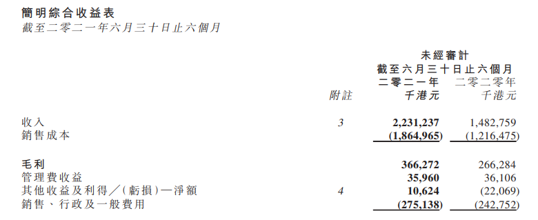 公告披露:截至2021年6月30日,集团收入为22.31亿港元(约人民币18.59亿元),同比增长50%;毛利3.66亿港元(约人民币3.05亿元),同比增长38%。