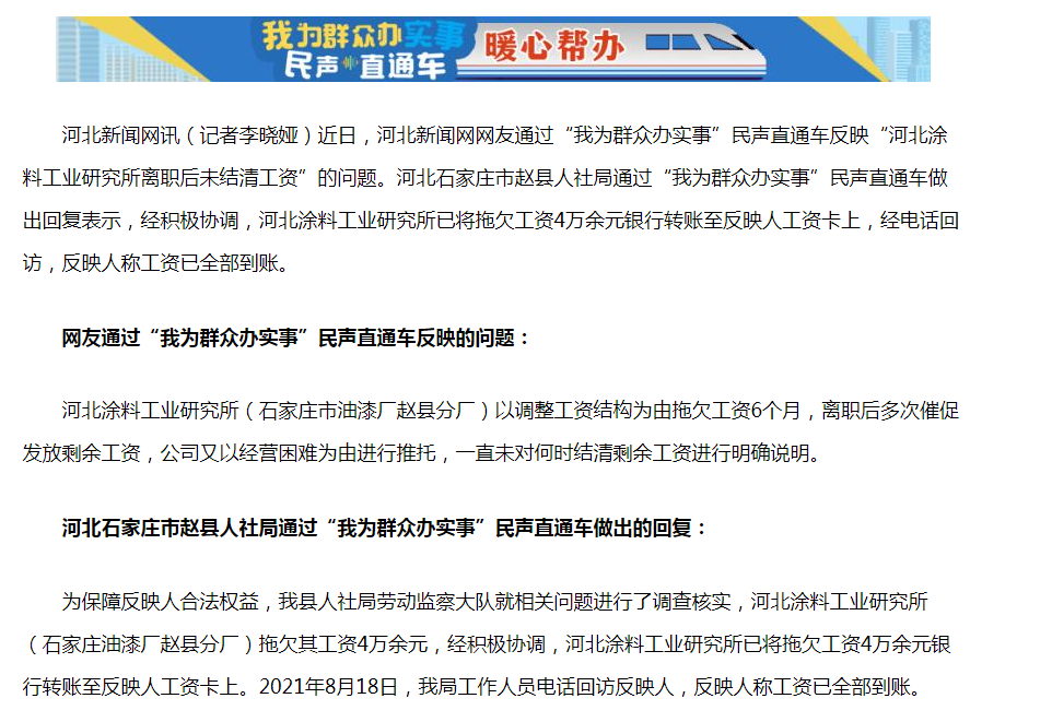 随后经河北石家庄市赵县人社局积极协调,目前河北涂料工业研究所已将拖欠工资4万余元银行转账至反映人工资卡上,经电话回访,反映人称工资已全部到账。