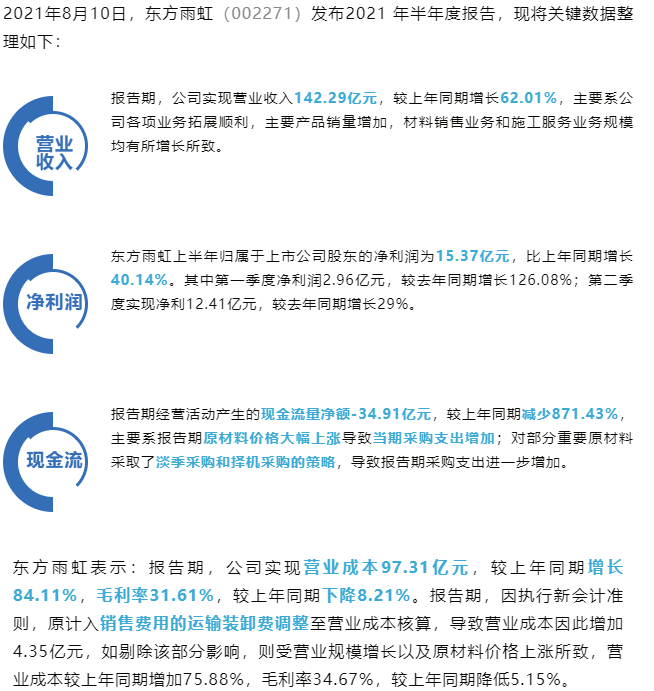 从东方雨虹2021年半年报表示,它的现金流数据过于反常,现金流量净额-34.91亿元,较上年同期减少871.43%。虽然东方雨虹给出了合理解释,主要是因为原材料价格上涨,东方雨虹的采购压力增加,以及为了缓解这个压力,甚至还预支出,进行备货。这不失为缓解后续压力的良策。