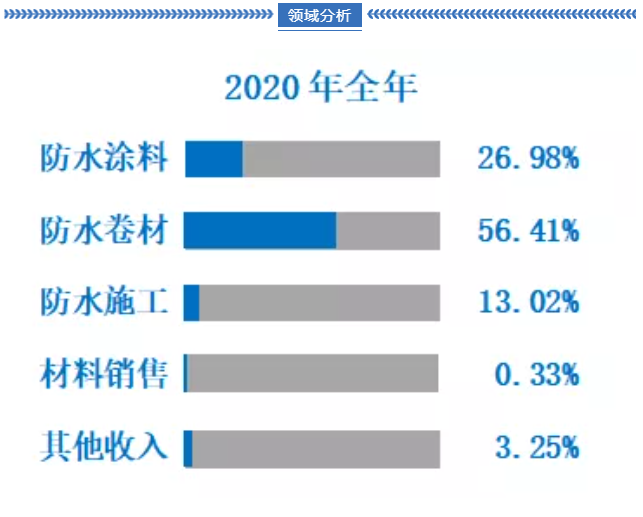 现阶段,东方雨虹的材料销售占整体的3.96%,与2020年0.33%相比有大幅度提高。此外防水涂料与其他收入的占比也有所提高,占比提高来源于防水卷材和防水施工的比例下降,但也不代表防水卷材和防水施工总量下降。据悉防水涂料、防水卷材、防水施工、材料销售、其他收入的营收分别是46.43亿、70.24亿、14.30亿、5.69亿、5.63亿,各板块营收比去年同期分别增长91.53%、51.93%、2.26%、1608.54%、85.32%。
