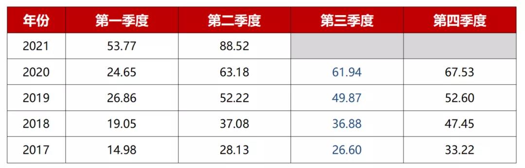 东方雨虹2017-2021年第二季度分季度营业收入一览表(单位/亿元)