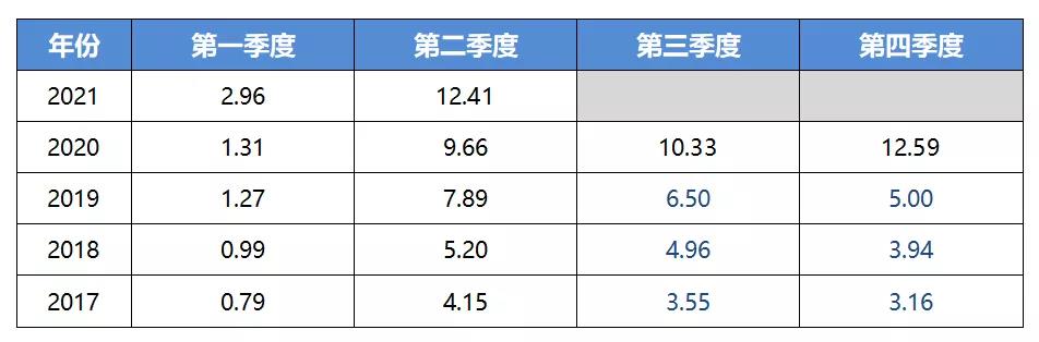东方雨虹2017-2021年第二季度分季度净利润一览表(单位/亿元)