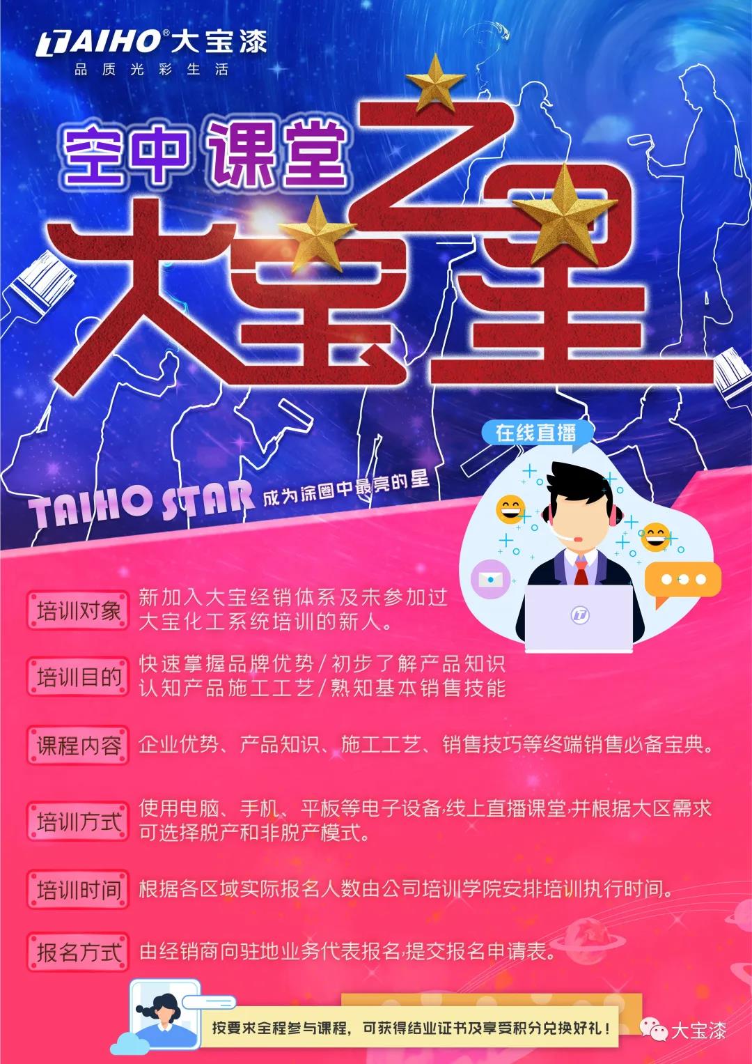 因此,大宝漆十分注重业务员及导购素质的培养和教育。据了解,大宝培训学校自2011年成立至今,源源不断为终端市场提供专属培训服务,因应市场瞬息万变,培训模式亦与时共进,于2021年8月开启“大宝之星│星空计划”的空中课堂线上培训系列课程。